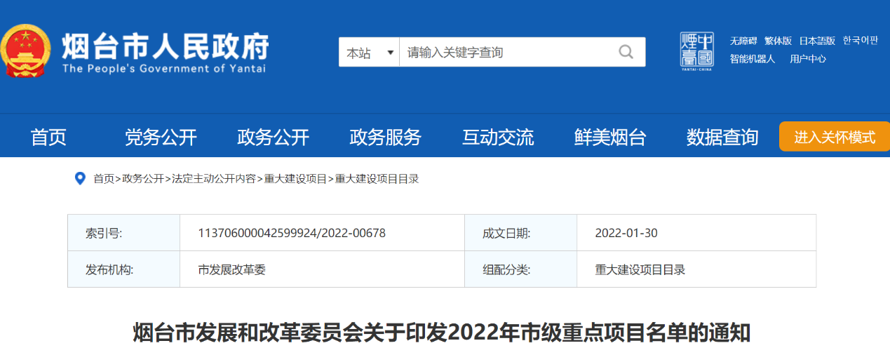 該項目已于2021年12月由煙臺市生態(tài)環(huán)境局進行環(huán)評受理。