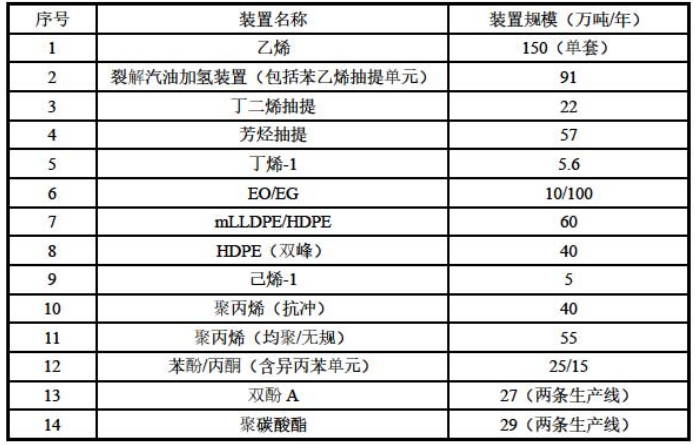 建設規模:乙烯及下游——乙烯生產規模為150 萬噸/年,乙烯下游規劃建設10/100 萬噸/年環氧乙烷/乙二醇、40 萬噸/年HDPE、60 萬噸/年mLLDPE/HDPE以及5 萬噸/年已烯-1。