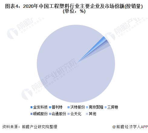 根據工程塑料行業主要上市企業工程塑料業務銷量進行測算,2020年,工程塑料行業集中度相對較低,銷量CR3、CR5企業合計市場份額分別達約3.2%及4.2%。