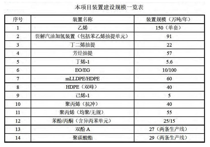項目新建一套150萬噸/年乙烯裝置。 通過蒸汽裂解方式生產乙烯, 進而延長產品鏈,生產下游石化產品。 主要產品包括乙烯焦油、 裂解碳五、 丁二烯、 苯乙烯、 甲苯、 環氧乙烷、 一乙二醇、 二乙二醇、 聚乙烯、 聚丙烯、 聚碳酸酯等。