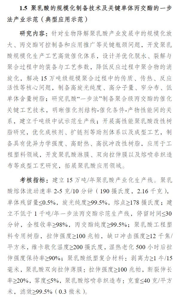 其中,煤炭清潔高效利用技術、先進結構與復合材料、高端功能與智能材料3個重點專項均涉及可降解材料。 "聚乳酸規模化制備技術及關鍵單體丙交酯一步法產業示范",強調,要針對聚乳酸規劃化生產和丙交酯技術進行攻克,還要求加大開發聚乳酸高性能改性樹脂,拓展聚乳酸在淋膜、雙向拉伸膜、熔噴布等領域應用。