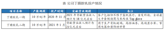 丁腈膠乳:公司已于2020年11月和2021年 1 月共投產2套合計 20 萬噸丁腈膠乳產能,為國內產能最大裝置。面對疫情帶來的醫用丁膠手套需求大幅提升,公司充分延伸產業鏈建設投產丁腈膠乳產線 20 萬噸/年,成為全國最大的丁腈膠乳裝置,客戶包括藍帆醫療、金發科技以及全球最大手套制造商馬來西亞 Top glove 等。