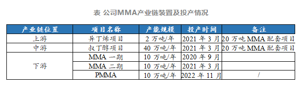 公司現有40萬噸叔丁醇產能,同時積極發展新材料業務,向下游延伸MMA、PMMA產業,通過不斷延伸產業鏈,提升抗風險能力,目前,公司 20 萬噸/年 MMA項目已全部投產,10萬噸/年 PMMA 項目也正處于建設當中,預計 2022 年 11 月投產。MMA用于有機玻璃、高檔油漆、高端顯示屏、家用電器和裝飾材料等;PMMA 生產線用于照明器材、光學、飛機座艙和防彈玻璃以及光導纖維等。投產后公司將完成形成“異丁烯-叔丁醇—MMA—PMMA” 的一體化完整產業鏈。