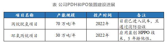 據悉,公司PDH裝置已進入試車階段,而根據前面提到的消息,該PDH裝置剛完成消防驗收。而配套PO裝置則已進入設備安裝階段,預計2022年可建成投產。