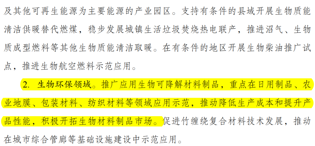 在生物環保領域,《規劃》要求,推廣應用生物可降解材料制品,重點在日用制品、農業地膜、包裝材料、紡織材料等領域應用示范,推動降低生產成本和提升產品性能,積極開拓生物材料制品市場。促進竹纏繞復合材料技術發展,推動在城市綜合管廊等基礎設施建設中示范應用。