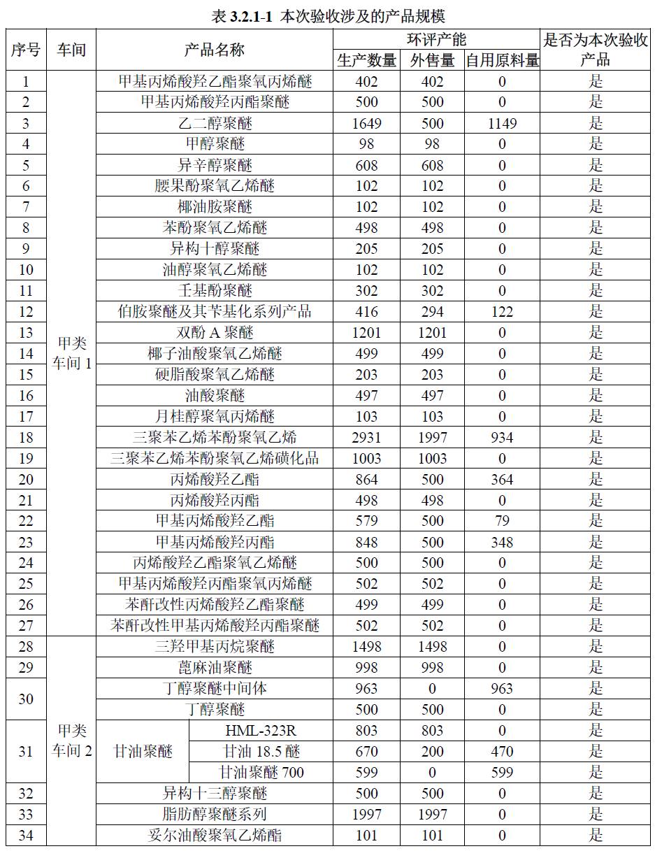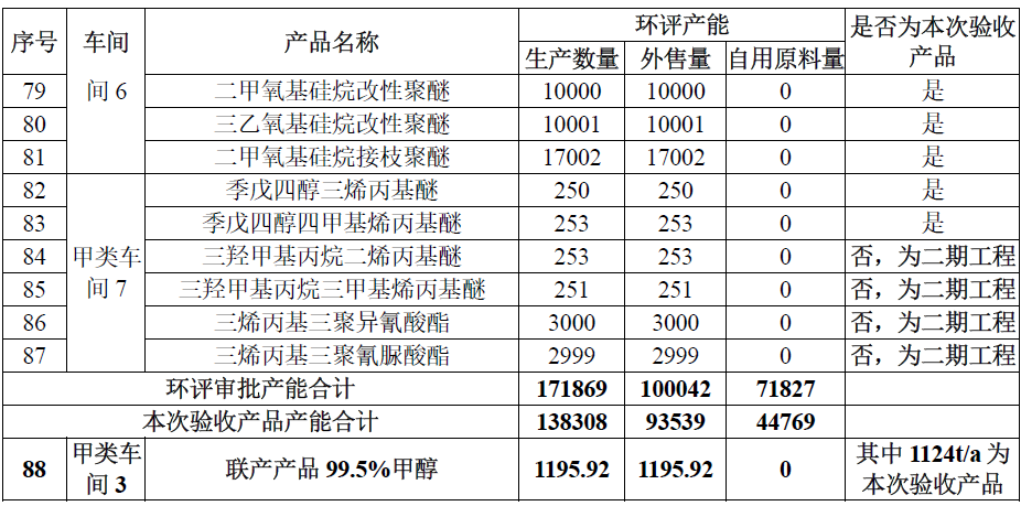 甲類車間4 甘油聚氧丙烯醚、甘油聚醚烯丙基封端,小計產能27058 噸/年(全部自用,不外售);甲類車間7 三羥甲基丙烷二烯丙基醚、三羥甲基丙烷三甲基烯丙基醚、三烯丙基三聚異氰酸酯、三烯丙基三聚氰尿酸酯,小計產能6503 噸/年(外售量),均為二期建設項目產品。