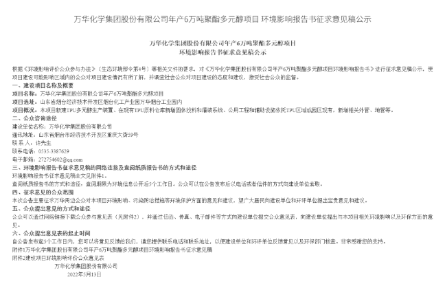 5月13日,萬華化學(xué)集團(tuán)股份有限公司年產(chǎn)6萬噸聚酯多元醇項(xiàng)目環(huán)境影響報(bào)告書征求意見稿公示,具體信息如下: