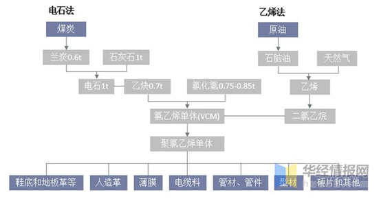 PVC生產工藝主要為“電石法”和“乙烯法”,其原材料分別為煤炭和原油。全球絕大部分國家采用石油天然氣路線。由于中國貧油富煤,我國PVC生產工藝以電石法為主。