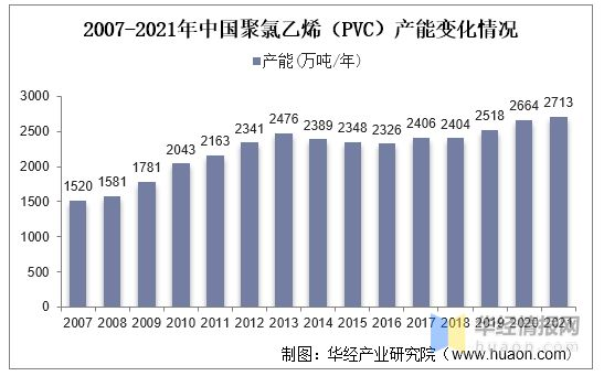 隨著國民經濟的迅速發展,我國PVC產能在快速提升。2007年以來,我國PVC產能總體上呈增長趨勢。據中國氯堿工業協會數據,2021年,中國聚氯乙烯(PVC)總產能達2713萬噸/年,較2020年提升49萬噸/年。