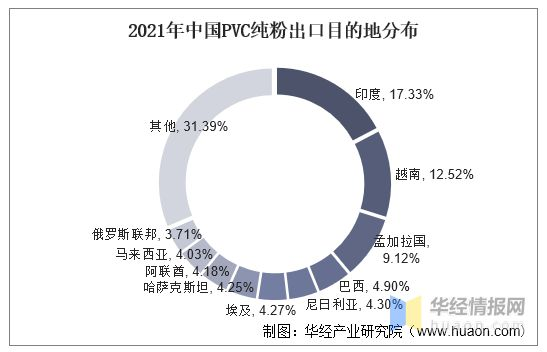 從出口目的地來看,我國PVC純粉產品主要出口南亞、東南亞以及中亞的部分地區,印度仍是中國PVC純粉出口的主要目的地,2021年全年,中國出口至印度的PVC純粉達到30.4萬噸,占中國出口總量的17.33%;出口至越南的PVC純粉22萬噸,占比12.5%;出口至孟加拉國的PvC純粉16萬噸,占比9.1%。