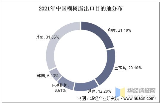 2021年國內累計出口糊樹脂7.7萬噸,其中,2021年出口印度1.63萬噸,占總出口量的21.1%;出口土耳其1.55萬噸,占比20.1%;出口越南0.94萬噸,占比12.2%。