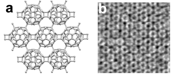 碳材料一直被認為是一種未來材料,制備新型碳材料一直是材料領域的前沿科學問題,以富勒烯、碳納米管、石墨烯、石墨炔為代表的新型碳材料的每一次發現都引發了材料學家的研究熱潮。單層聚合C60是一種全新的簇聚二維超結構,由 C60簇籠在平面上通過C-C鍵相互共價鍵合形成規則的拓撲結構。這種新型碳材料具有較高的結晶度和良好的熱力學穩定性,并具有適度的禁帶寬度,為碳材料的研究提供了全新思路。