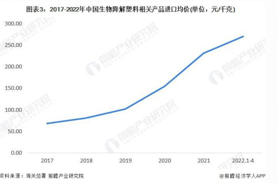 根據海關總署查詢,我國生物降解塑料相關產品的進口均價自 2017 年以來呈現快速上漲的態勢,2021 年我國生物降解塑料相關產品的進口均價為 154.47 元 / 千克,2021 年我國生物降解塑料相關產品的進口均價上漲到 231.14 元 / 千克,同比增長 49.63%;2022 年 1-4 月,我國生物降解塑料相關產品的進口均價更是上漲至 270.29 元 / 千克。生物降解塑料相關產品進口均價上漲幅度較大,行業企業應該謹慎防范進口風險。
