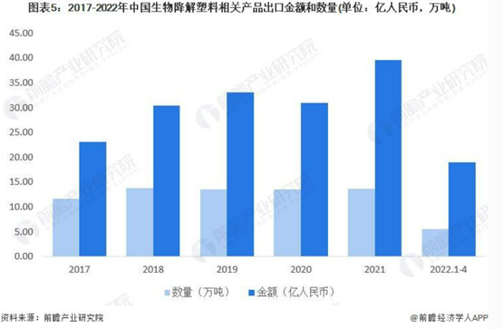 2021 年我國生物降解塑料的相關產品出口額 39.63 億元,同比增長 27.88%; 出口量 13.69 萬噸,同比增長 1.71%。2022 年 1-4 月,我國生物降解塑料的相關產品出口額約 19.00 億元,同比增長 76.82%; 出口量 5.56 萬噸,同比增長 39.37%。