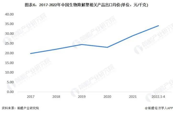 根據海關總署查詢,我國生物降解塑料相關產品的出口金額較進口金額低,由此看來我國的相關生物降解塑料產品的附加值普遍較低。2021 年我國生物降解塑料相關產品的出口均價為 28.94 元 / 千克,2022 年 1-4 月則為 34.16 元 / 千克,存在小幅度上漲的現象,但較進口均價來看,我國生物降解塑料相關產品的出口均價仍處于較低水平。