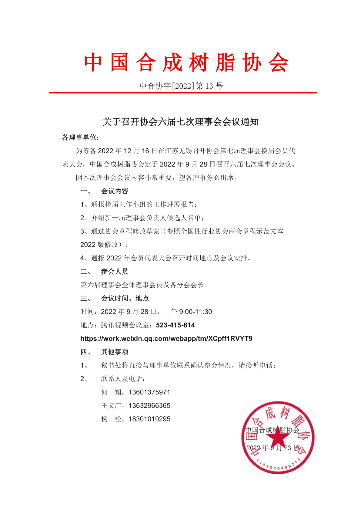 【會議通知】中國合成樹脂協會六屆七次理事會會議通知