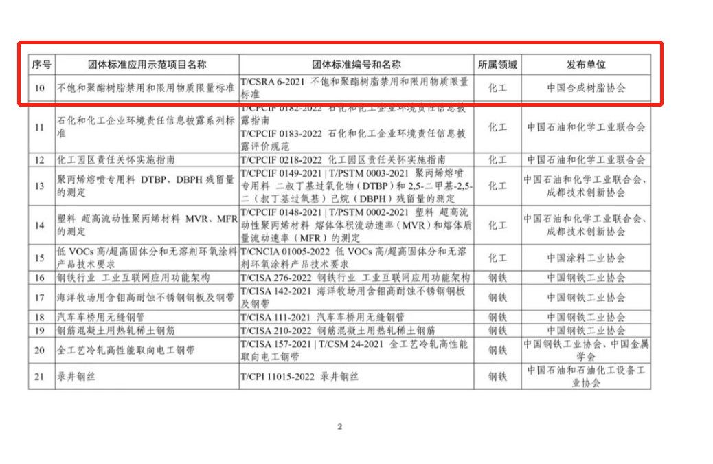 其中,中國合成樹脂協會申報的T/CSRA 6-2021《不飽和聚酯樹脂禁用和限用物質限量標準》成功入選團體標準應用示范項目。