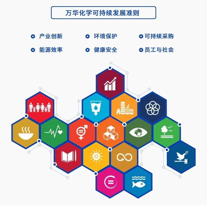 以實(shí)現(xiàn)聯(lián)合國可持續(xù)發(fā)展目標(biāo)為努力方向,以產(chǎn)業(yè)創(chuàng)新、環(huán)境保護(hù)、能源效率、健康與安全、可持續(xù)采購、員工與社會為主線,一幅完整的可持續(xù)發(fā)展“地圖”已然形成。未來,萬華化學(xué)將繼續(xù)以可持續(xù)發(fā)展理念定位企業(yè)自身,攜手上下游企業(yè)同德一心、守正創(chuàng)新,為人類社會發(fā)展貢獻(xiàn)萬華力量!