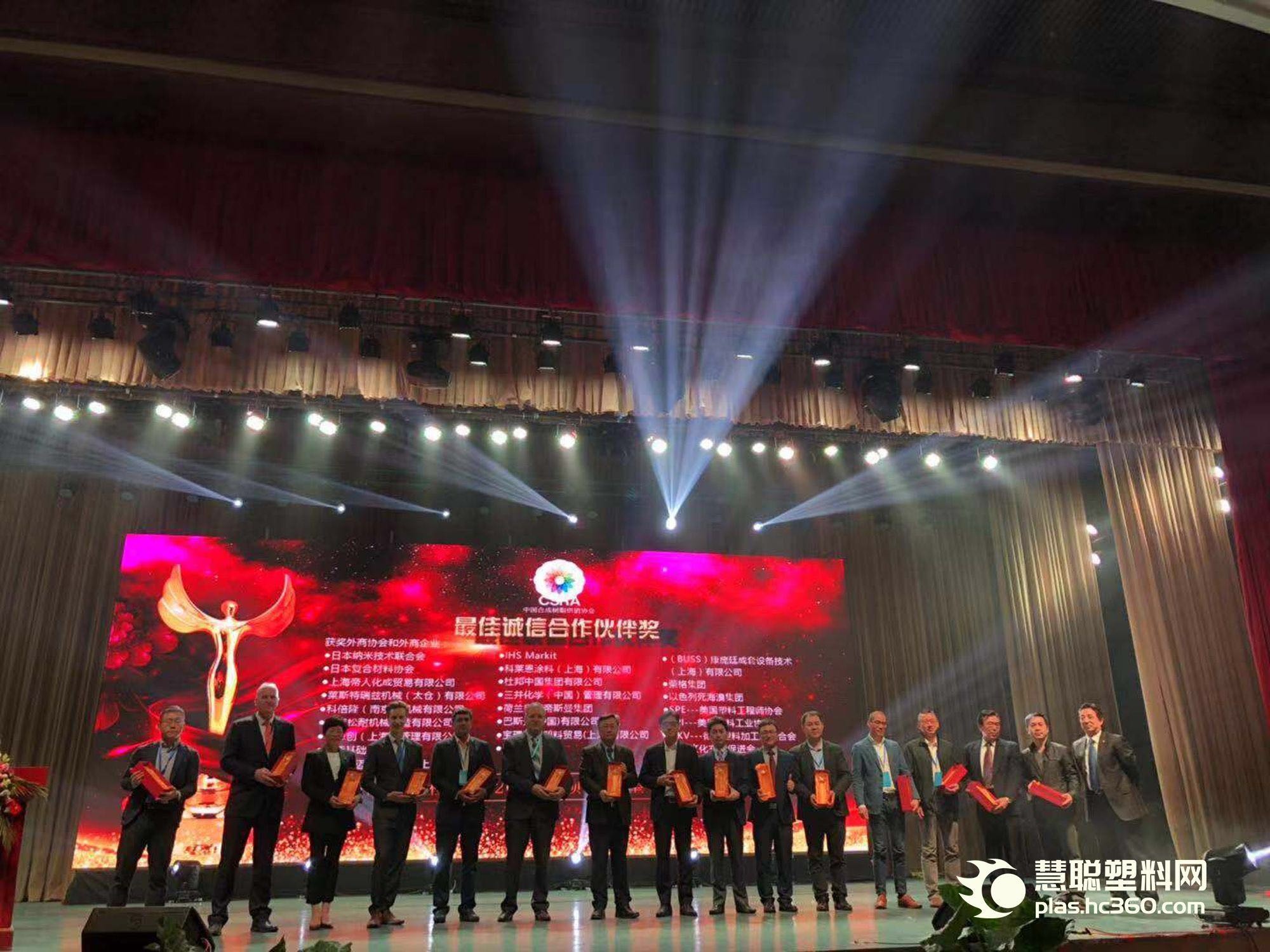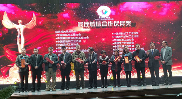 協會對20年來誠信合作的外商協會和外商企業頒發“最佳誠信合作伙伴獎”。獲獎企業有日本納米技術聯合會、日本復合材料協會、上海帝人化成貿易有限公司、萊斯特瑞茲機械(太倉)有限公司、科倍?。暇C械有限公司、上海松耐機械制造有限公司、科思創(上海)管理有限公司、沙特基礎工業公司、(BUSS)康龐廷成套設備技術(上海)有限公司、科萊恩涂料(上海)有限公司、杜邦中國集團有限公司、三井化學(中國)管理有限公司、荷蘭皇家帝斯曼集團、巴斯夫(中國)有限公司、寶理工程塑料貿易(上海)有限公司、LG化學、IHS Markit、榮格集團、以色列死海溴集團、SPE---美國塑料工程師協會、SPI(NPE北京辦)---美國塑料工業協會、GKV---德國塑料加工業聯合會、中德文化交流促進會、克勞斯瑪菲(浙江)有限公司、馬格澳邁塑料機械(上海)有限公司、國際化學品制造商協會、霍尼韋爾(中國)有限公司、索爾維集團、朗盛化學、阿科瑪(中國)投資有限公司、中歐汽車輕量化聯盟。