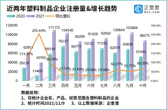 企查查數據顯示,2021年前10月我國新增塑料制品企業88.49萬家,同比增長35.74%。最近的10月,我國新增塑料制品企業8.83萬家,同比增長65.05%。9月新增10.56萬家,同比增長51.73%。