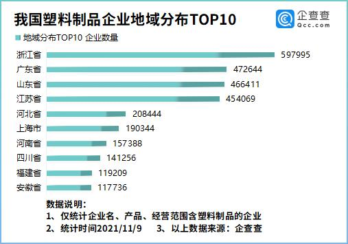 企查查數據顯示,從地域分布來看,浙江以59.79萬家塑料制品企業排名第一,廣東省、山東省分別有47.26萬家、46.64萬家塑料制品企業,排在第二、三名。此后依次為江蘇省、河北省、上海市等。