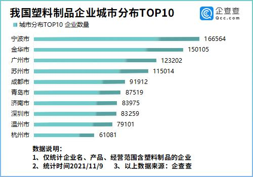 企查查數據顯示,從城市分布來看,寧波位居榜首,有16.65萬家塑料制品企業。金華、廣州分別有塑料制品企業15.01萬家、12.32萬家,位居前三。此后依次為蘇州市、成都市、青島市等。